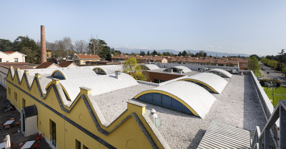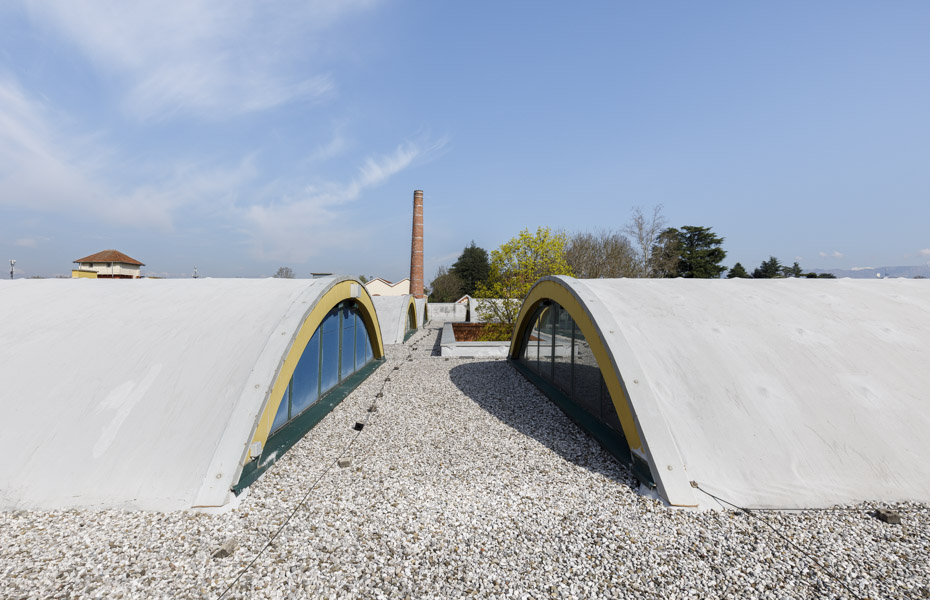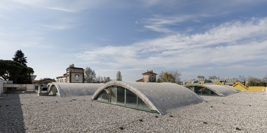 La copertura dell’edificio, oltre a ospitare le macchine degli impianti, i torrini, gli sfiati e gli scarichi, presenta alcune strutture sporgenti con tetti a volta e grandi finestre sui lati corti, che permettono alla luce naturale di illuminare gli ambienti interni.